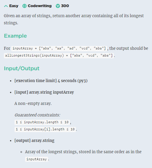 | CodeSignal 11번 allLongestStrings 문제풀이 (0) | 2020.01.20 |