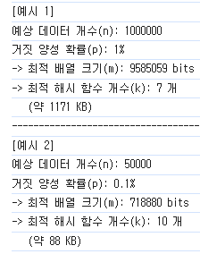 - k = m/n * ln(2) [반올림 하면 해시 개수]