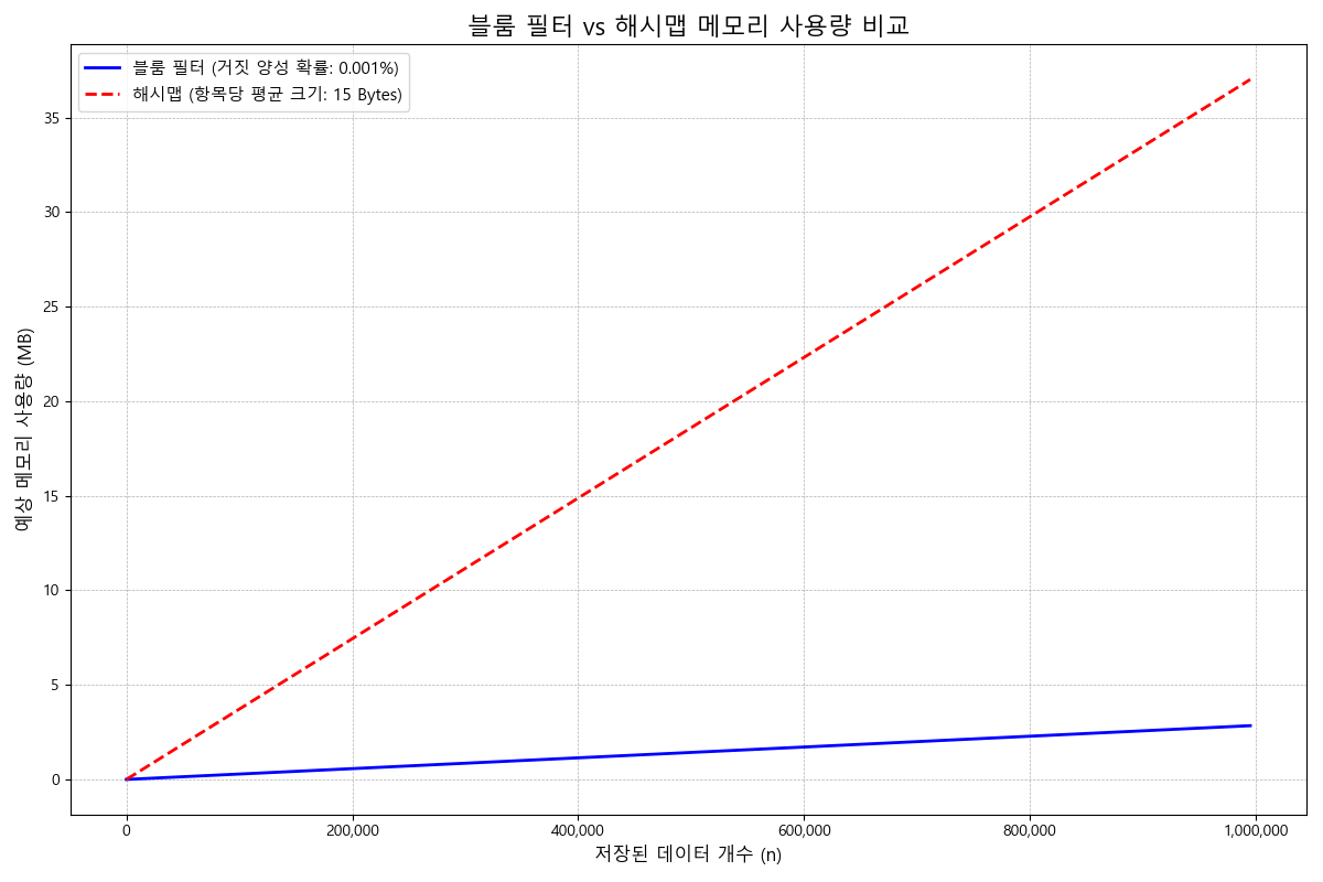 을 기준으로 데이터 개수가 커짐에 따라 해시맵과 블룸 필터의 메모리 사용량이 어떻게 커지는지 시각화해봤습니다.